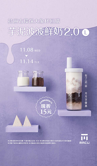 活動內容:攜帶「麻古環保大象杯」至門市,回購「#芋泥波波鮮奶2.0(L) 」 現折15元(已含環保杯折扣 5 元)