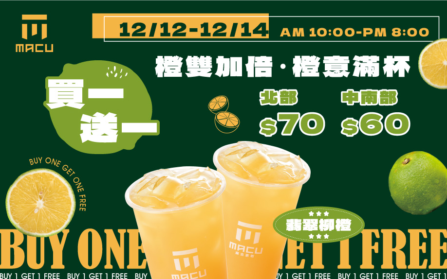 麻古茶坊支持台灣在地優質農產品, 於12月12日至12月14日上午十點至晚間八點,推出限時優惠「橙雙加倍,橙意滿杯,翡翠柳橙買一送一」!嚴選色澤橙黃飽滿的台灣柳橙,果肉風味濃郁、果皮氣味清新,搭配溫潤翡翠綠茶茶湯,完美平衡果的鮮甜與茶的溫潤,冬日果實的補充站就在麻古茶坊!