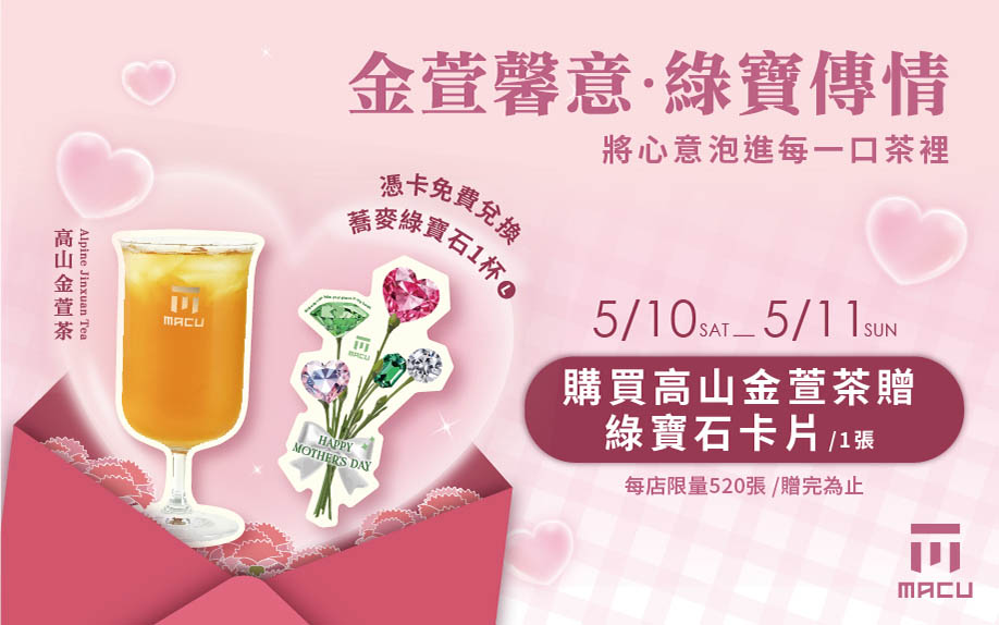 母親節,是說愛的最好時機。今年麻古茶坊用一杯好茶,為消費者與最愛的母親之間搭起一座溫暖的橋樑。為回饋顧客長期支持,並傳達對母親細水長流的感謝心意,特別推出母親節限定活動「金萱馨意.綠寶傳情」,讓每一口茶香都成為一份溫柔告白。