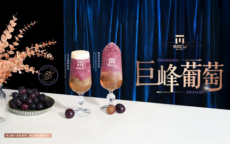 麻古茶坊大學生人氣票選NO.1巨峰葡萄系列9/18強勢回歸!全台門市推出三款矚目飲品 : 「芝芝葡萄果粒」、「葡萄果粒波波」及全新登場的「巨峰葡萄冰沙」,展現巨峰葡萄飽滿果肉與馥郁香氣的極致風味,一杯之中,凝縮葡萄的豐盈與純粹。